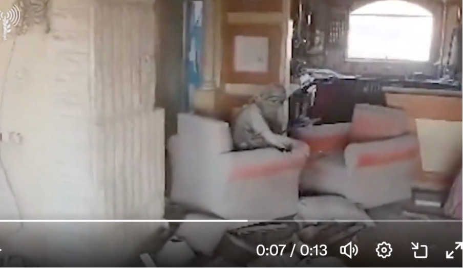 Video footage shows a drone-mounted camera entering a second-storey window of a heavily damaged building. The drone moves deeper into a rubble-strewn room and hovers to focus on a figure slumped in a lounge chair. Covered in dust, a wound to his right-hand seeping blood, Sinwar looks with exhausted eyes at the drone. He throws a piece of wood at the camera, which follows the movement.